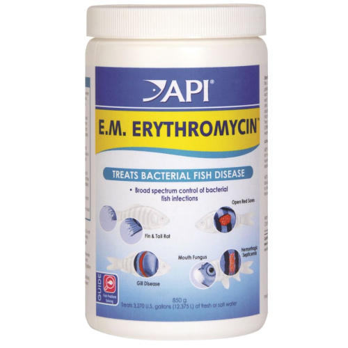 API E.M. Erythromycin Powder treats a broad range of bacterial fish infections including hemorrhagic septicemia, fin and tail rot, mouth fungus (cotton mouth), open red sores and bacterial gill disease in freshwater and saltwater aquariums. Powdered fish health remedies allow easy dosing for easier, faster, and more effective treatment.