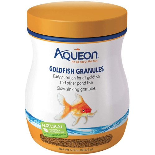 Aqueon Goldfish Granules - 5.8 ozAqueon Goldfish Granules are loaded with natural colors and ingredients that will provide daily nutrition for the common goldfish, fancy orandas or koi . With added vitamins, minerals and trace nutrients this formula has a higher concentration of ingredients that bring out the colors in fish such as: spirulina, marigold powder, chili powder, and more. Granules sink to the bottom of the aquarium faster than the flake variety and are sometimes preferred for larger fish that can accommodate a larger food portion. Formulated so that fish utilize more of what they eat and create less waste these granules will not cloud the water when fed as directed.