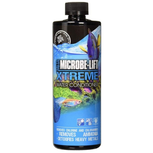 Microbe-Lifts Xteme Water Conditioner is a buffered liquid water conditioner for aquariums which removes and detoxifies chlorine and ammonia wile destroying chloramines. Nitrite, copper and heavy metals are also detoxified while the waters alkalinity boosts.