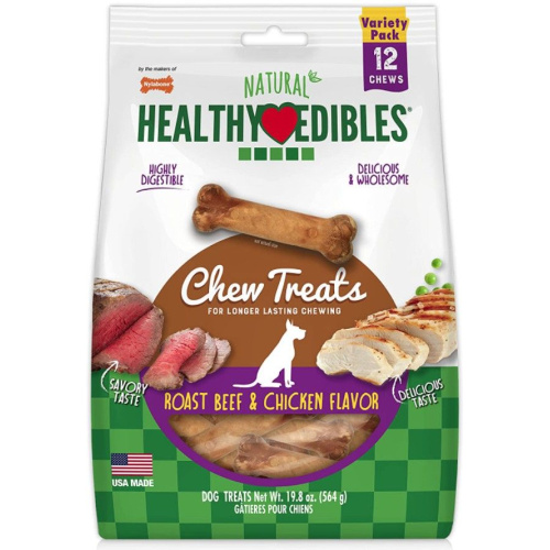 Nylabone Natural Healthy Edibles Variety Pack - Roast Beef & Chicken - Regular - 12 PackNylabone Healthy Edibles Wholesome Chews are completely edible and highly digestible, providing an enjoyable alternative to traditional rawhide. They are 100% gluten-free and are made with natural, savory flavors your dog will go wild for.