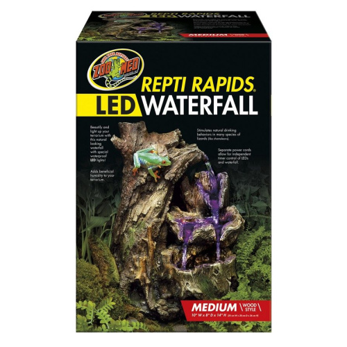 Zoo Meds Repti Rapids Wood Style LED Waterfall adds light, beauty and excitement to your reptile or amphibians terrarium! This naturalistic water feature adds beneficial humidity to your pets tank while providing fresh, running water that stimulates your pets natural drinking behaviors. Waterproof LEDs light up the cascading water for a stunning light show!